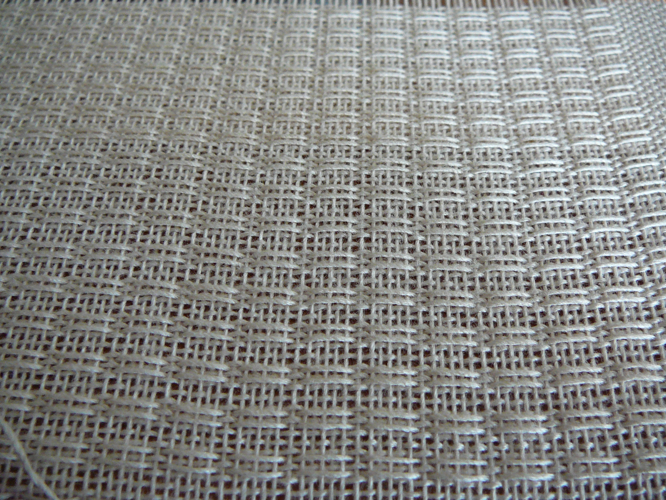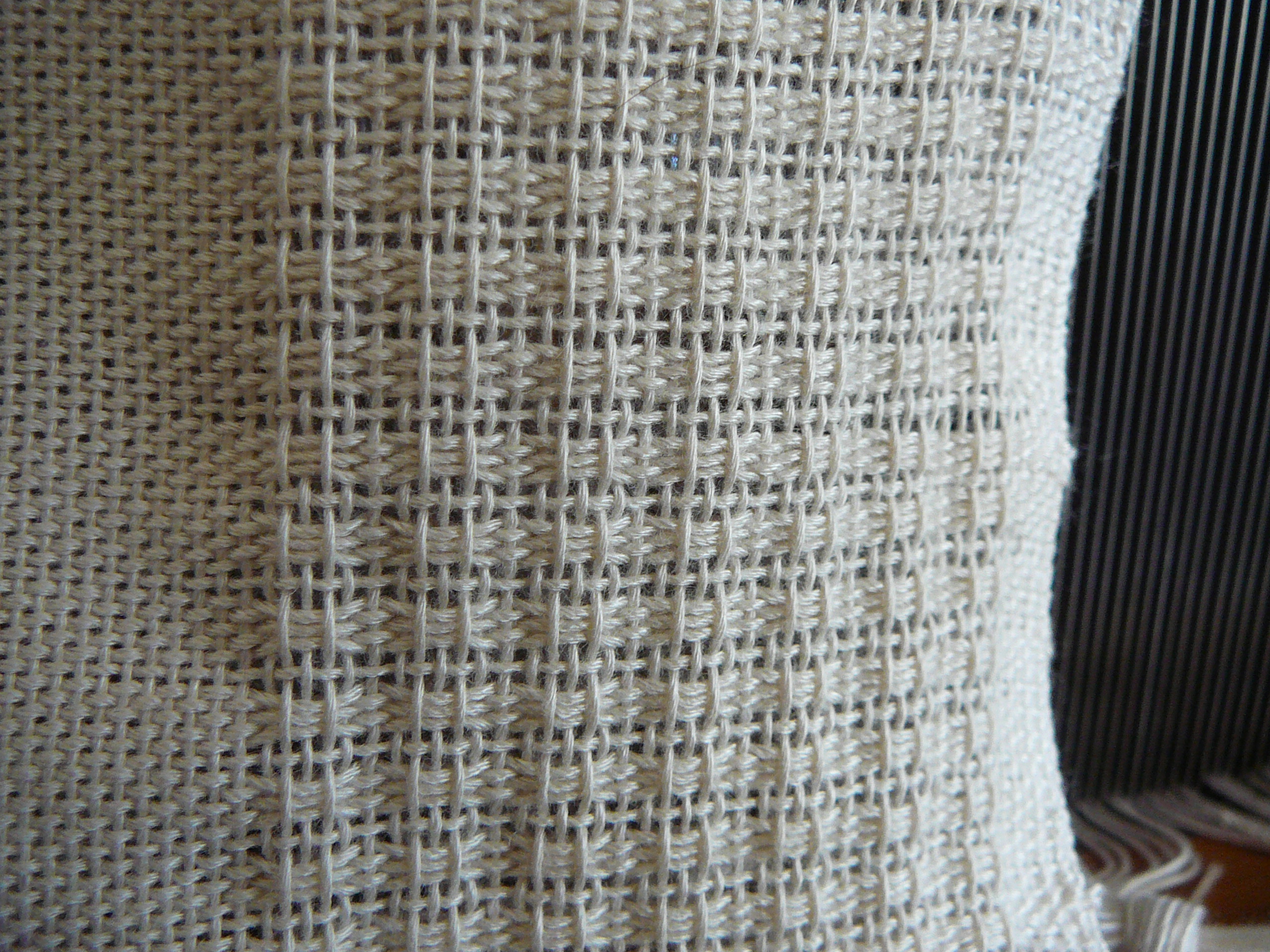 I finished the shawl. I took pictures of the pattern as it appeared on the loom because I just love the way it changes after I wash the item. I made no sample of this before I made it, I just followed the directions in Handwoven magazine (September/October 2009, p. 48; Budget Bamboo Shawl).