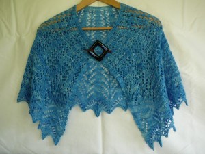 Remember the blue dyeing job I did?  Of course not, it was months ago.  Well, here’s a link to refresh your memory (and mine too).  I used that yarn to knit the Summer Solstice Mystery Shawl.  Here is a picture of my finished product (click on it to see it bigger):
