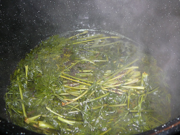 Though I do intend to dye with the flowers and leaves in my garden, first I wanted to start with the carrots. So, Friday afternoon I pulled the leafy green part off 4 bunches of fresh, organic carrots.