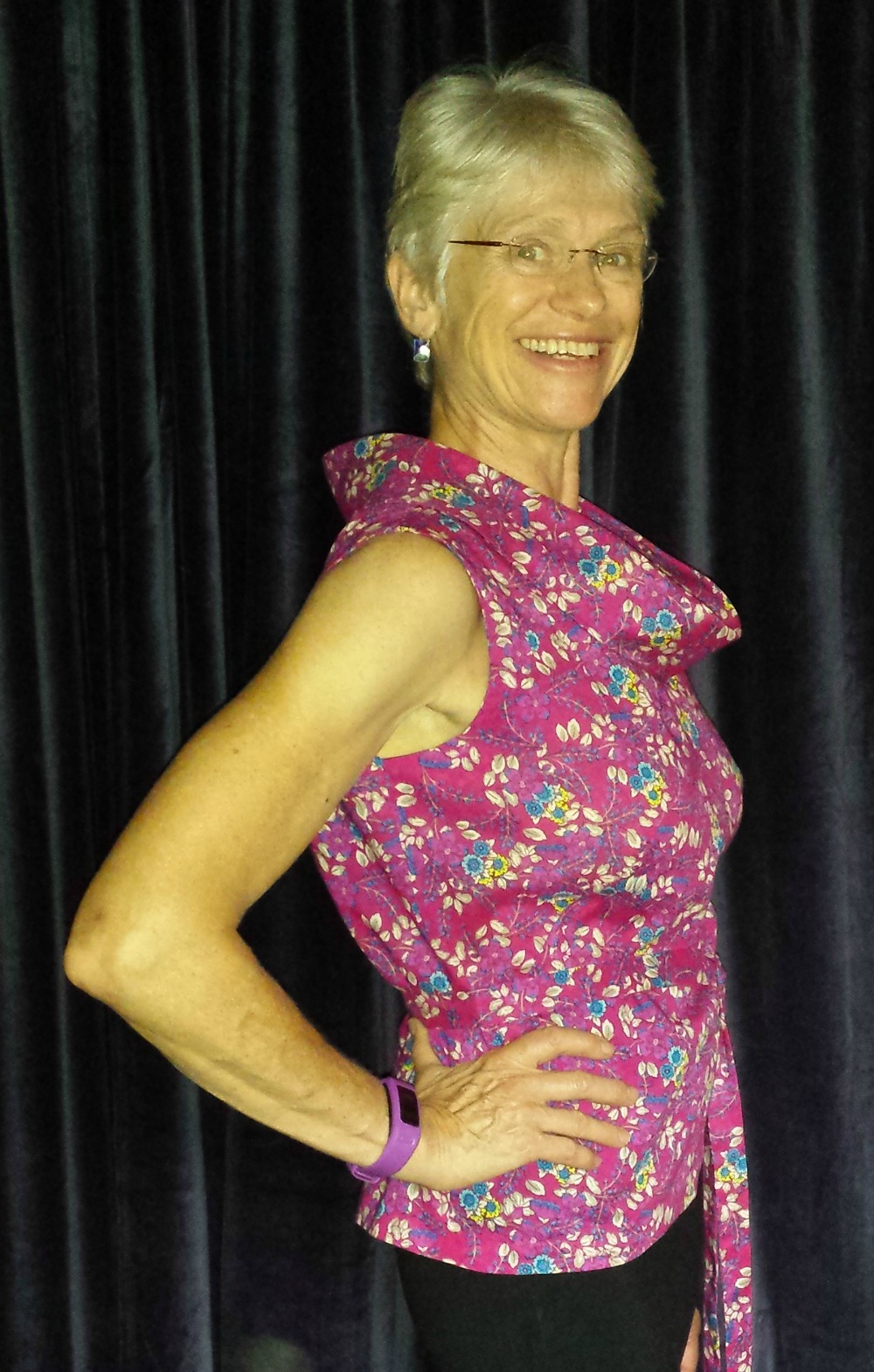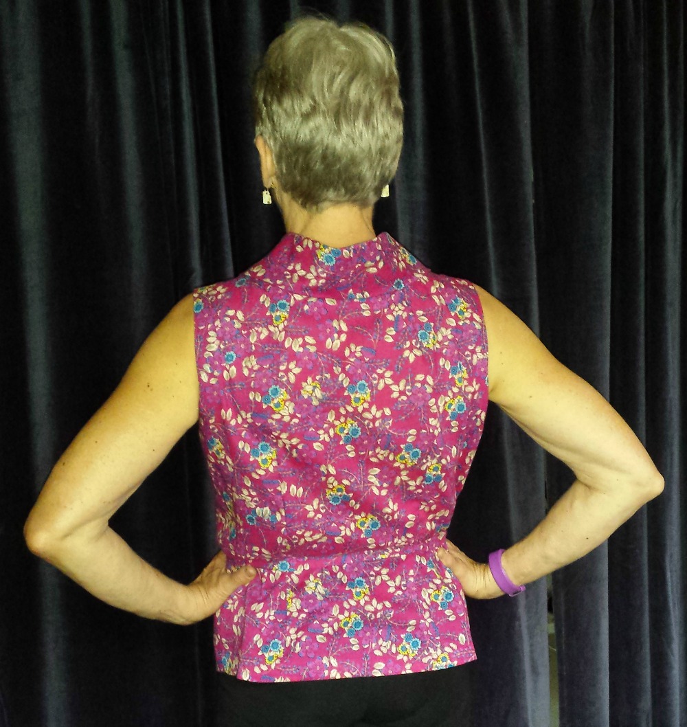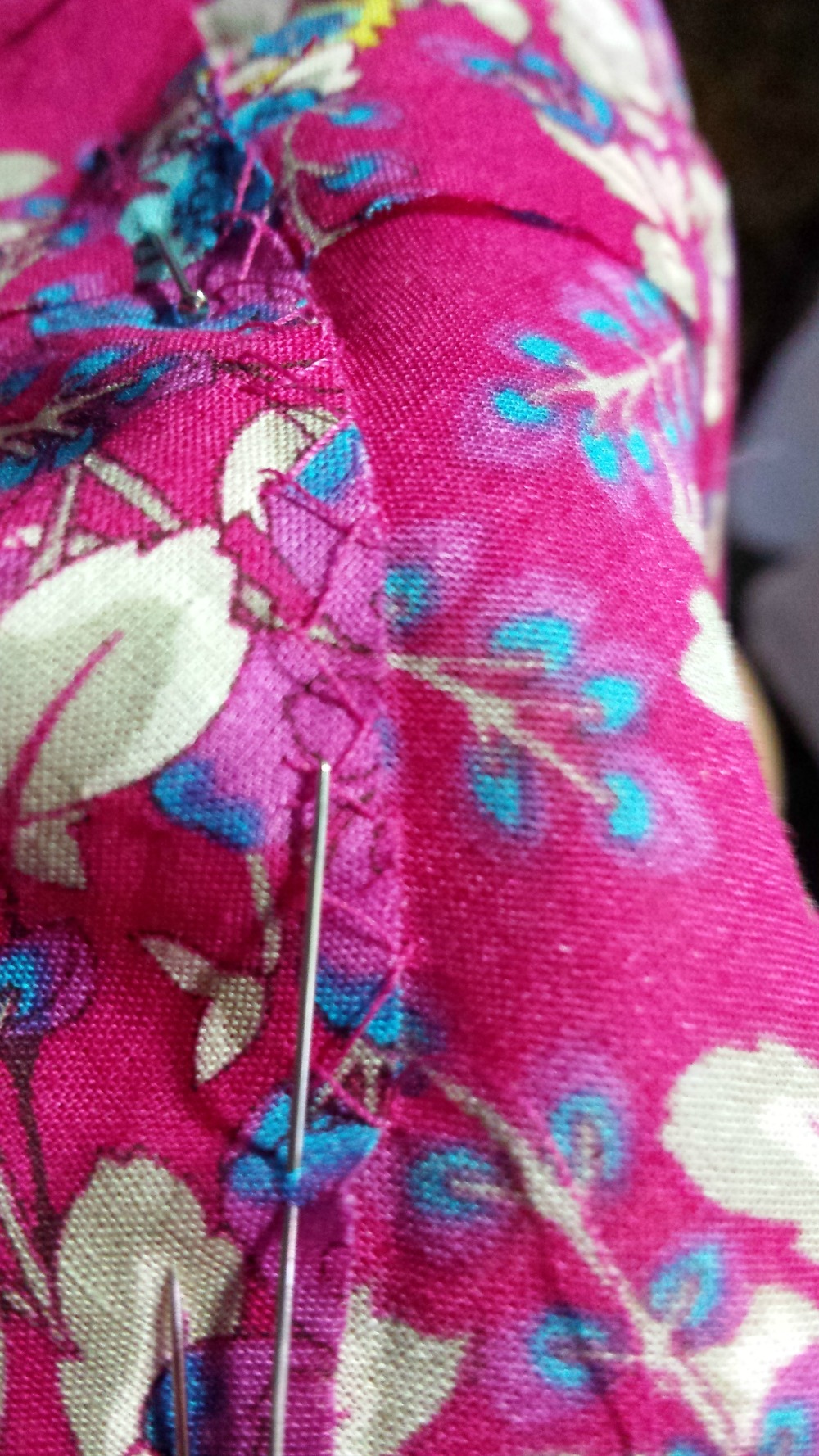 The picture below shows both. The armhole facing is at the bottom, the collar bias strip sewn down is along the top. I know it’s hard to see with this printed fabric.