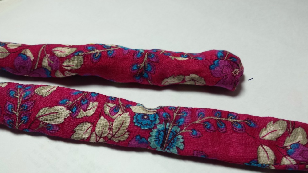 Next comes the sash, the self fabric tie belt. The drawing in the pattern instructions show the opening to one of the far ends of the sash, so that’s what I did. I sewed the right sides together and left about 2 inches open near one of the ends. Then I proceeded to pull it through. Ugh! Since I didn’t have enough fabric left to put the pattern piece on the fold (as they suggested in the layout), I ended up with a seam in the middle. Couple that with the fact that I had to pull a couple of feet worth of sash through you can see why I say Ugh. It took me three days of working short amount of times (I wanted to avoid total frustration in which I rip it apart or something more drastic).